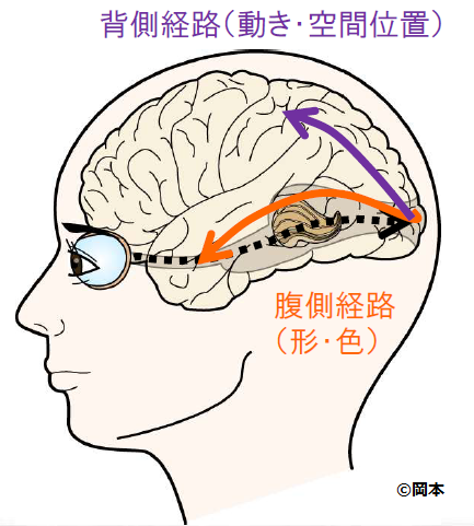 岡本先生曰く、目の神経細胞である網膜から出された視覚情報は、一旦後頭部に集められ、そこから脳内の別の2つの経路を通って行くそうです。その名も、「背側経路」と「腹側経路」。それぞれで行われる処理が異なり、背側経路では”動き・空間位置”が確認され、腹側経路では”形・色”が確認されます(下の絵を参照)。それぞれで処理された情報は統合された上で認知に至るわけですが、この統合のメカニズムについてはまだ解明されていないそうです…!
