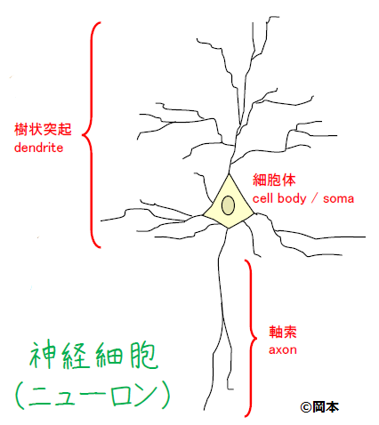 ”神経細胞”、これはどこかで聞いたことがあるような気がします。神経細胞はニューロンとも呼ばれ、ざっくりと描くと以下の様な姿をしているそうです(注:細胞によって形や大きさは様々!)。他の神経細胞から送られてきた情報信号は樹状突起から入力され、軸索を通してまた別の神経細胞へ出力されていきます。