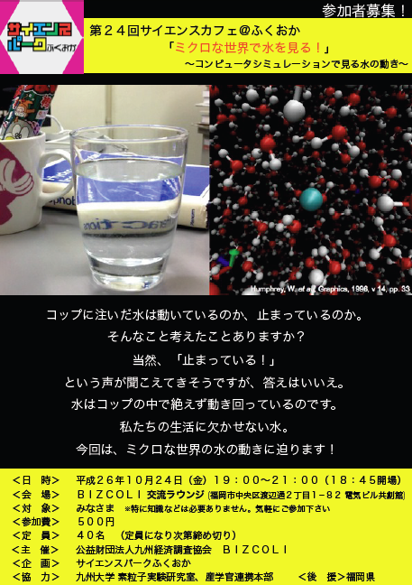 第24回のテーマは「ミクロな世界で水を見る!~コンピュータシミュレーションで見る水の動き~」でした。コップの中に静かに入った水。なんの変化も起きていないように見えて、実はミクロの世界ではすごいことが起きていました!!