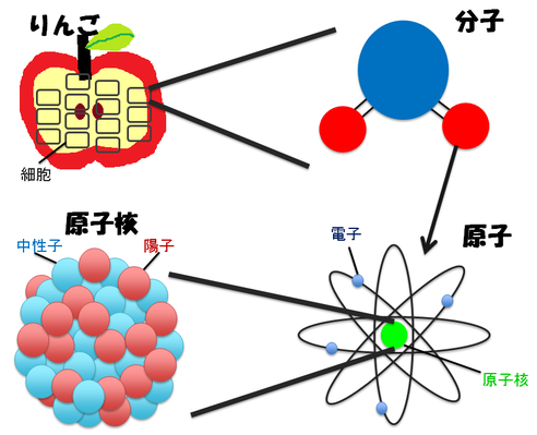 さて、皆さん原子核とは何か知っていますか?リンゴを例に説明すると、リンゴをばらすと1つ1つの細胞からできていて、その細胞は分子からできていて、分子は原子からできています。その原子をさらに分けると、原子は原子核と電子でできていて、その原子核は陽子と中性子からできています。これは学校の授業でも習いますね!