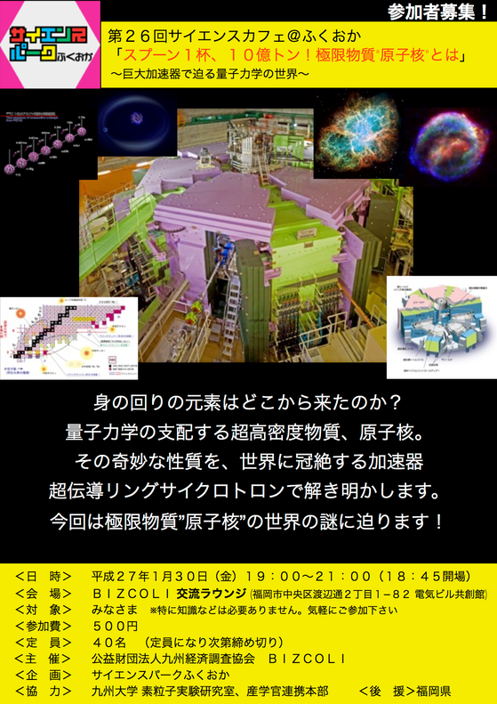 サイエンスカフェ@ふくおか、第26回目のテーマは「スプーン一杯、10億トン!極限物質”原子核”とは〜巨大加速器で迫る量子力学の世界〜」です!原子核という言葉は知っていても、それが一体どんな物質で、どんな性質を持っているのかというのは知らない方が多いのでは・・・?今回は極限物質である原子核の不思議に迫ります!!