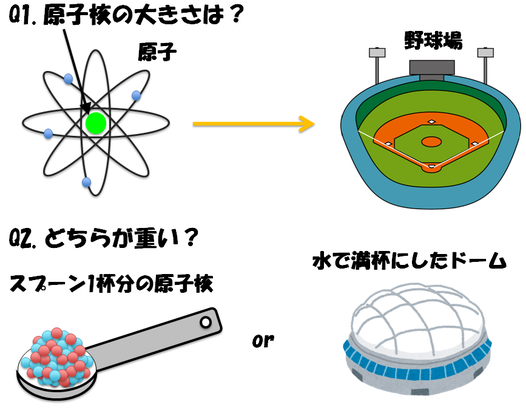 Q1.原子の大きさが野球場くらいだとすると、原子核はどのくらいの大きさになるのか?