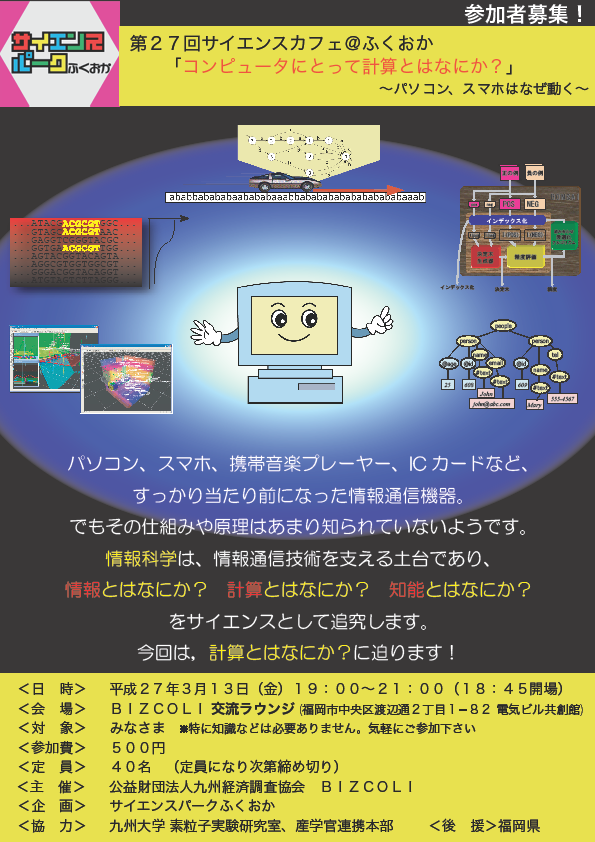 サイエンスカフェ@ふくおか、第27回目のテーマは「コンピュータにとって計算とはなにか?〜パソコン、スマホはなぜ動く〜」です。今回は計算とはなにか?に迫ります!!