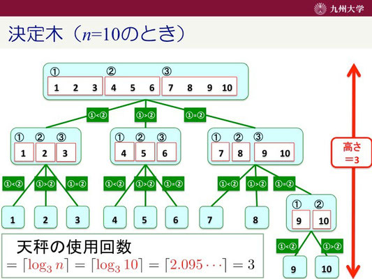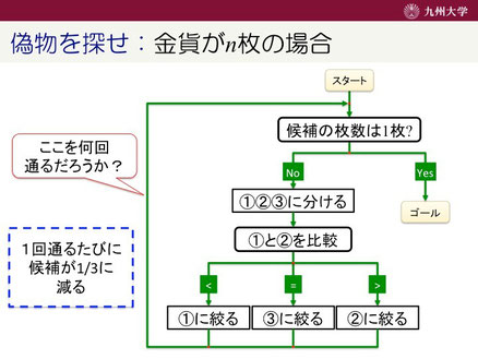 ここで、金貨の枚数と天秤の使用回数の関係を考えます。上の図にも書いていありますが、金貨の枚数をn枚とすると、