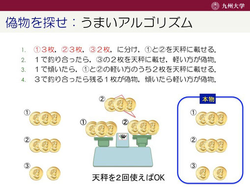 この方法だと、天秤を最大2回使えば偽物を見つけることができます!さっきの方法より早く見つけることができます。ですが、この程度の枚数だと、どちらの方法でもあまり変わらないのでは・・・?と思っちゃいますね。