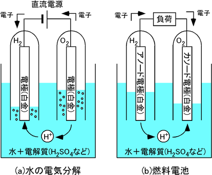 電気分解は、水に電気を通して水と酸素に分解させる反応でした。実は、燃料電池ではこの逆のプロセスで水素を使って発電が行われているんです!