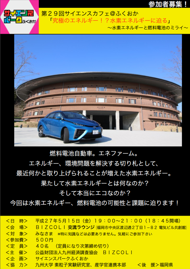 サイエンスカフェ@ふくおか、第29回のテーマは「究極のエネルギー!?水素エネルギーに迫る〜水素エネルギーと燃料電池のミライ〜」でした。