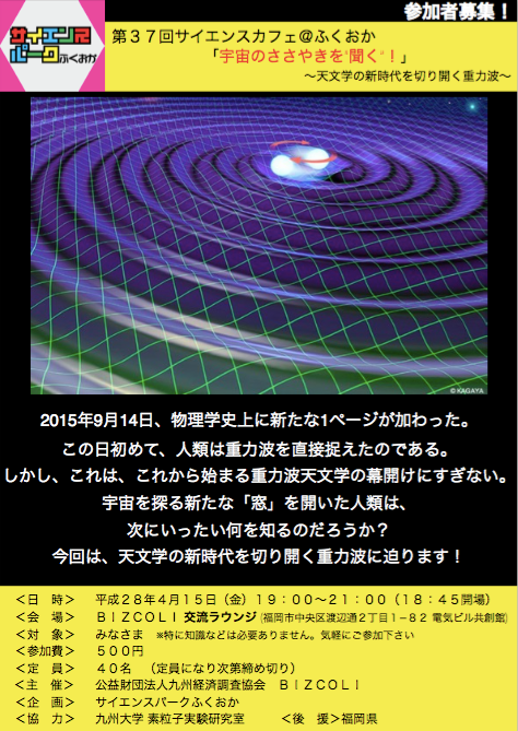 サイエンスカフェ@ふくおか、第37回のテーマは「宇宙のささやきを”聞く”!〜天文学の新時代を切り開く重力波〜」です!