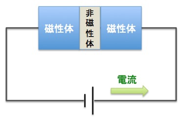 電流を流すと、電子は非磁性体を通ってもうひとつの磁性体へと向かいます。