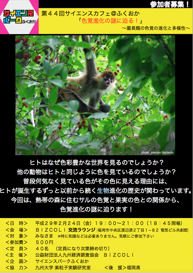 第44回のテーマは「色覚進化の謎に迫る!〜霊長類の色覚の進化と多様性〜」