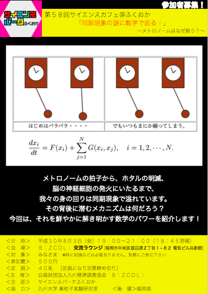 第58回「同期現象の謎に数学で迫る!」〜メトロノームはなぜ揃う〜