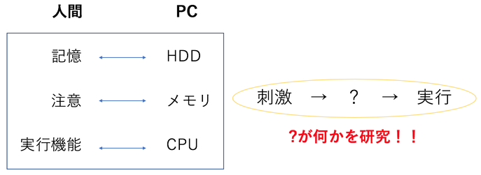 山田先生は認知心理学という、臨床心理学と比べると規模は小さいがとても面白い学問を学ばれていました。人をパソコンやロボットのように考え、刺激を与え行動を調べその間にどのような思考をしているかというのを探る実験です。具体的には以下のような関連を持ちます。