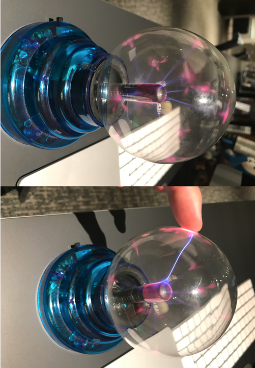以下に載せてある写真はプラズマボールと呼ばれる商品で、先生が私費で購入したものを持ってきて頂きました。先生はまず私たちに、プラズマが身近にあるものだということを知って欲しかったのだそうです。