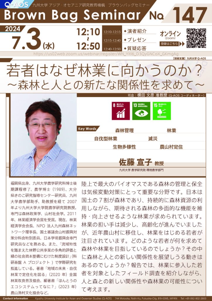 【7/3開催】第147回Brown Bag Seminar Series「若者はなぜ林業に向かうのか?~森林と人との新たな関係性を求めて~」