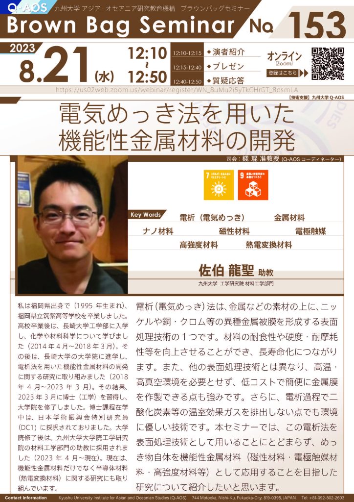 【8/21開催】第153回Brown Bag Seminar Series「電気めっき法を用いた機能性金属材料の開発」