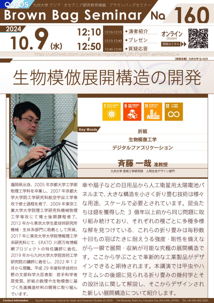 【10/9開催】第160回Brown Bag Seminar Series「生物模倣展開構造の開発」