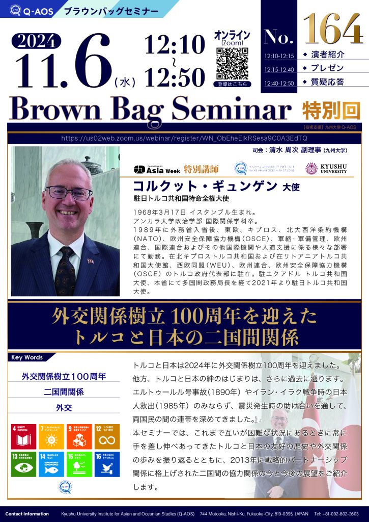 【11/6開催】第164回 特別回 Brown Bag Seminar Series「外交関係樹立100周年を迎えたトルコと日本の二国間関係」