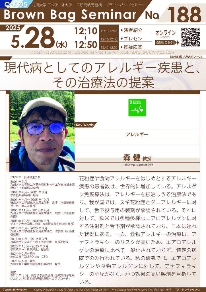 【5/28開催】第188回Brown Bag Seminar Series「現代病としてのアレルギー疾患と、その治療法の提案」