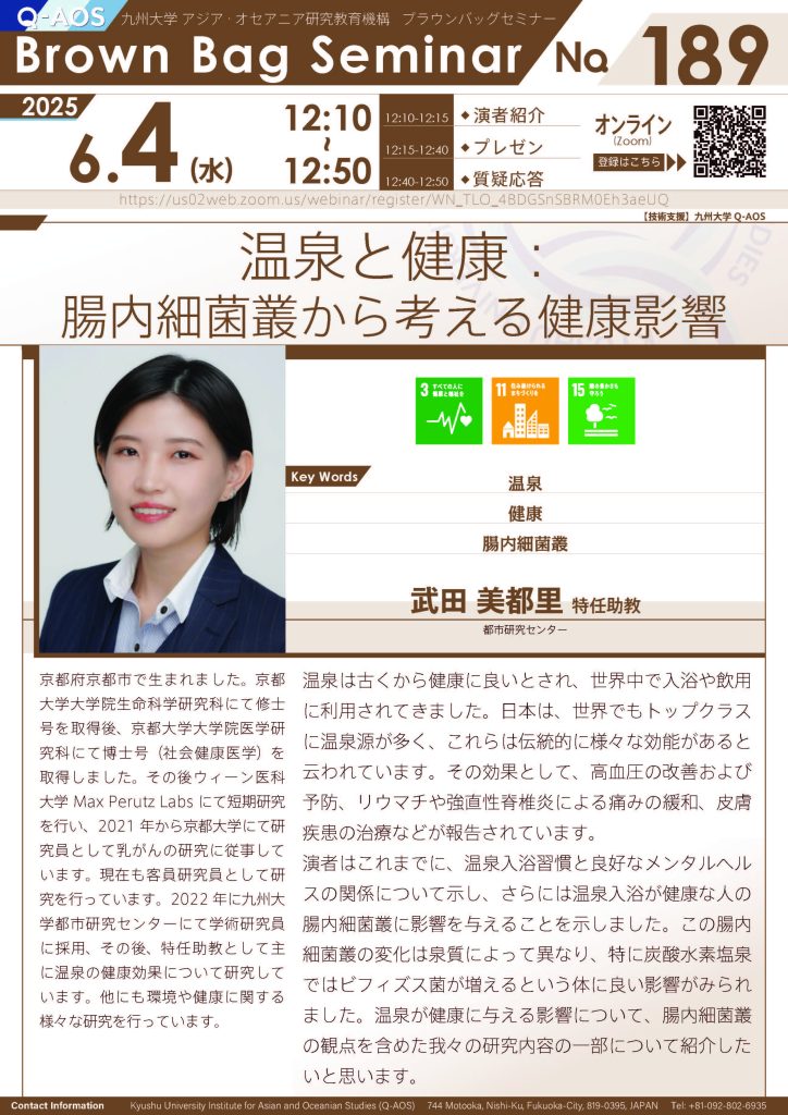 【6/4開催】第189回Brown Bag Seminar Series「温泉と健康 腸内細菌叢から考える健康影響」