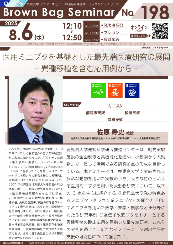 【8/6 開催】第198回アジア・オセアニア研究教育機構(Q-AOS)Brown Bag Seminar Series「医療用ミニブタを基盤とした最先端医療研究の展開 -異種移植を含む応用例から-」