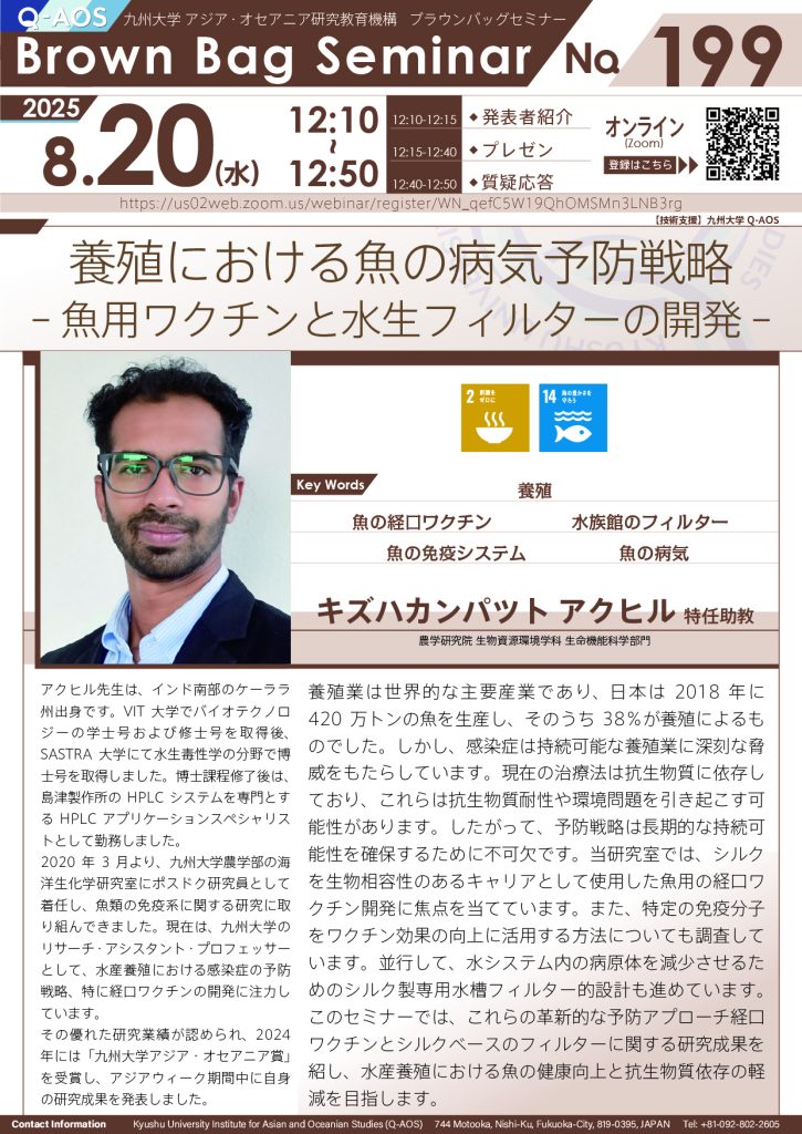 【8/20 開催】第199回アジア・オセアニア研究教育機構(Q-AOS)Brown Bag Seminar Series「養殖における魚の病気予防戦略 – 魚用ワクチンと水生フィルターの開発 -」