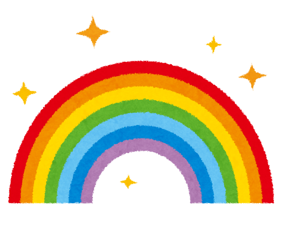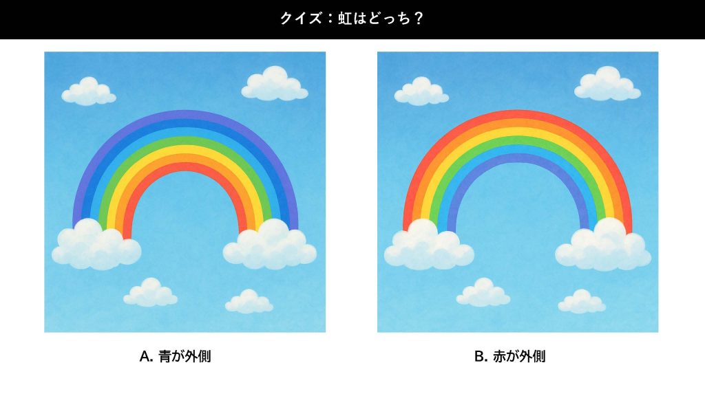 正解は、どちらも「虹」です!一般的な虹は赤が外側ですが、青が外側のほうも、「副虹(ふくにじ)」と呼ばれるれっきとした虹です。副虹は色の順番が逆になるのです!虹は太陽の光が屈折してできていますが、青のほうがたくさん屈折します。ここから、光についてのお話が深まっていきます。