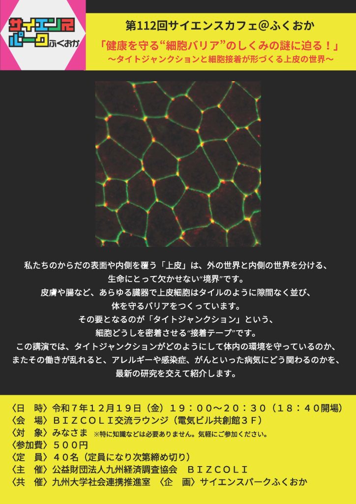 【12/19(金)開催】第112回サイエンスカフェ@ふくおか「健康を守る“細胞バリア”のしくみの謎に迫る!!」~タイトジャンクションと細胞接着が形づくる上皮の世界~