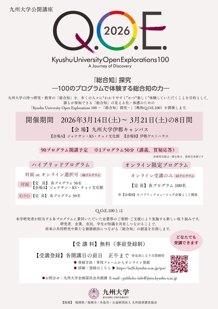 「Kyushu University Open Explorations 100 -「総合知」探究-」(略称Q.O.E.100)を開催します。