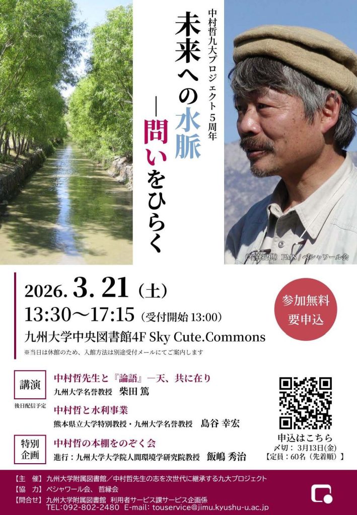 ※お車でお越しの方は、守衛所にて「中村哲九大プロジェクト5周年:未来への水脈ー問いをひらく」にいらした旨、お伝えください。