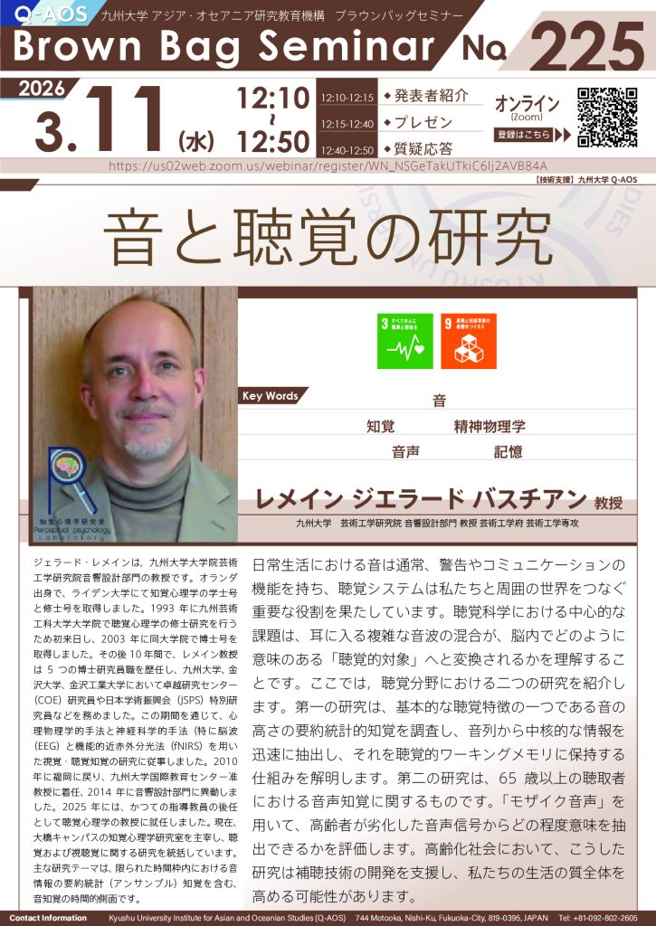 【3/11 開催】第225回アジア・オセアニア研究教育機構(Q-AOS)Brown Bag Seminar Series「音と聴覚の研究」
